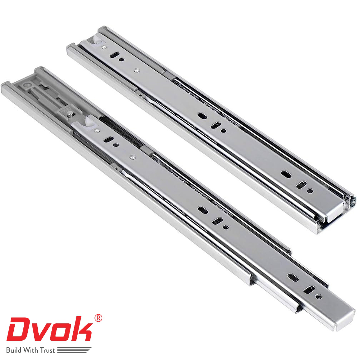 Full-extension drawer system with soft-close mechanism and floor-mounted bearings for smooth, stable movement. Available in 400, 450 & 500mm, supports up to 45 kg, made from durable cold rolled steel, and tested for 50,000 cycles.